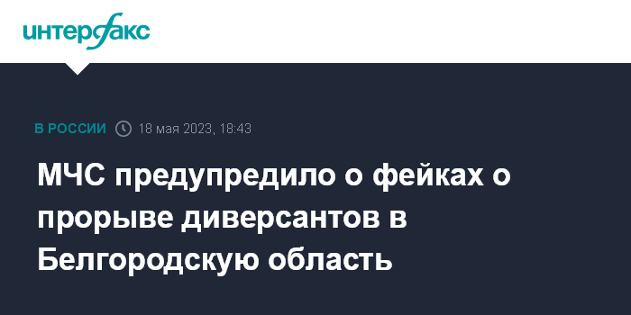 Москва. 18 мая. INTERFAX.RU - ГУ МЧС по Белгородской области предупредило, что сообщения от имени ведомства о прорыве на территорию области диверсионно-разведывательной группы - это фейки.