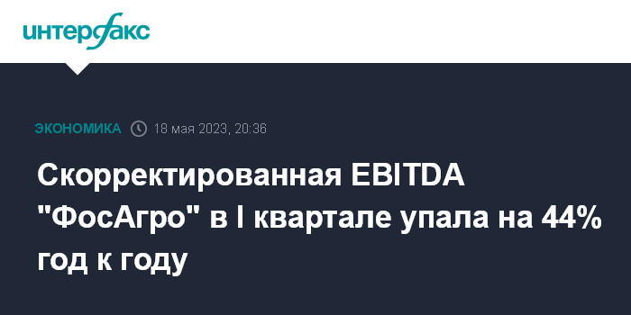 Москва. 18 мая. INTERFAX.RU - Скорректированная EBITDA "ФосАгро" в I квартале составила 49 млрд рублей, что на 44% ниже показателя за I квартал 2022 года, но на 10% выше, чем в IV квартале, сообщила компания.