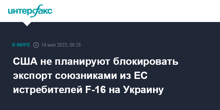 Москва. 19 мая. INTERFAX.RU - США не будет препятствовать союзникам в передаче истребителей F-16 на Украину, сообщает CNN со ссылкой на осведомленные источники.