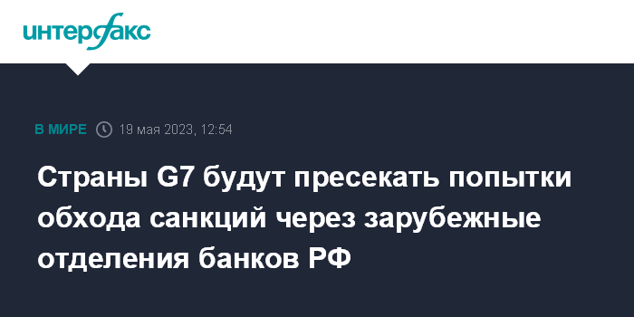 Москва. 19 мая. INTERFAX.RU - Страны G7 будут пресекать попытки использовать зарубежные отделения российском банков для обхода санкций, введенных в отношении российской финансовой системы, говорится совместном заявлении лидеров "Большой семерки".