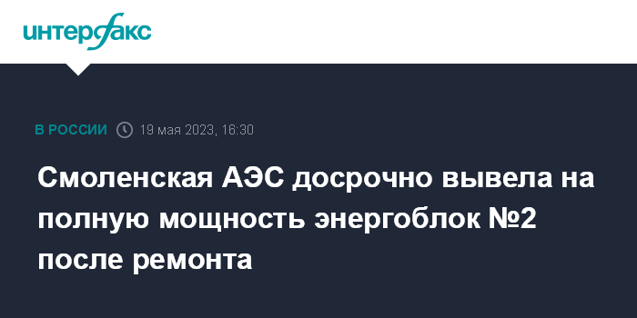 "19 мая 2023 года энергоблок №2 Смоленской АЭС выведен на 100% мощности после проведения планового текущего ремонта с элементами модернизации. Энергоблок возобновил работу на двое суток раньше срока, запланированного графиком ремонта", - говорится в сообщении.