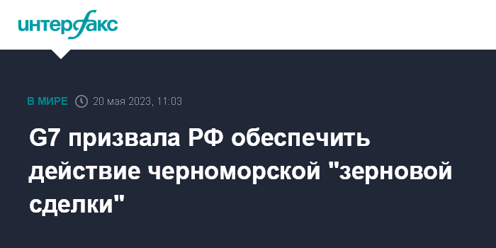 Москва. 20 мая. INTERFAX.RU - Лидеры стран G7 на саммите в Хиросиме обратились с призывом к России способствовать реализации черноморской зерновой инициативы.