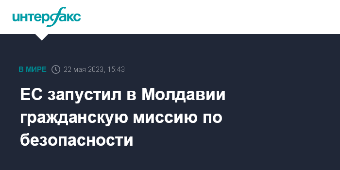 Москва. 22 мая. INTERFAX.RU - Совет ЕС в понедельник дал "зеленый свет" началу работы гражданской миссии в Молдавии по укреплению устойчивости сектора безопасности в сферах кризисного управления и противодействия гибридным угрозам.