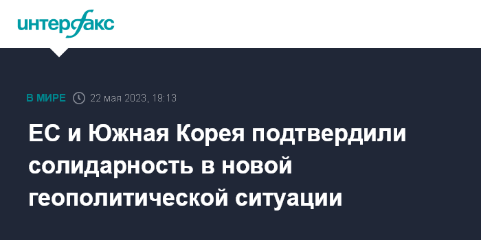 Москва. 22 мая. INTERFAX.RU - Европейский союз и Южная Корея подтвердили, что в нынешнем геополитическом кризисе они находятся по одну сторону, договорились отстаивать порядок, "основанный на правилах", а глава Европейского совета Шарль Мишель напомнил, что в Корейскую войну 1950-1953 годов европейцы воевали на стороне Юга.