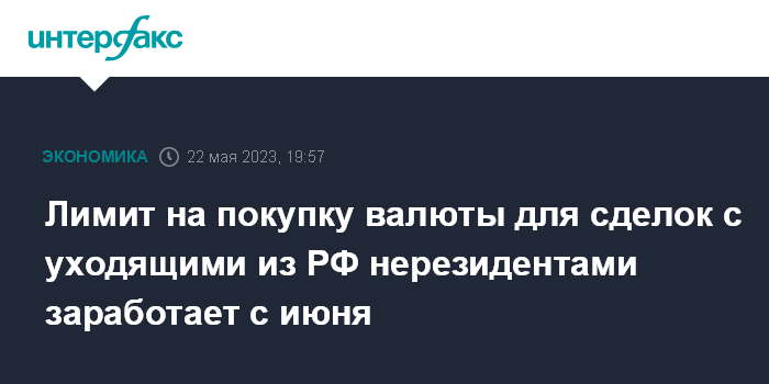 Москва. 22 мая. INTERFAX.RU - Лимит на покупку валюты на внутреннем российском рынке при продаже "недружественными" иностранными компаниями активов в РФ должен заработать со следующего месяца.