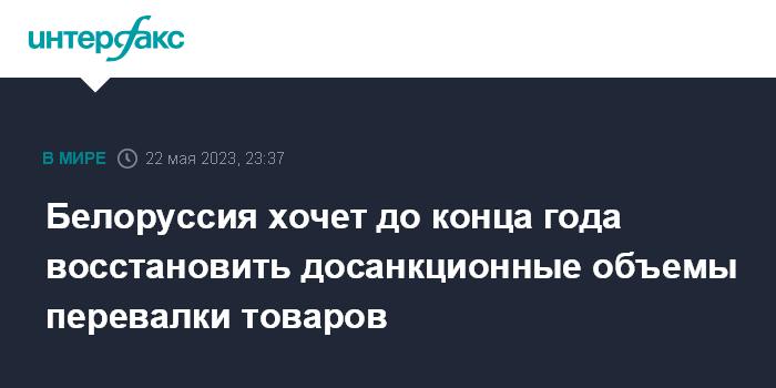 Москва. 22 мая. INTERFAX.RU - Белоруссия рассчитывает до конца года восстановить досанкционные объемы перевалки товаров через порты, сообщил белорусский посол в Москве Дмитрий Крутой в понедельник в эфире гостелеканала "Беларусь 1".