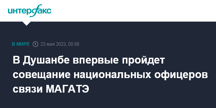 Москва. 23 мая. INTERFAX.RU - Совещание национальных офицеров связи Международного агентства по атомной энергии (МАГАТЭ) впервые пройдёт в Душанбе с 23 по 26 мая, будут обсуждаться совершенствование и продвижение программ технического сотрудничества.