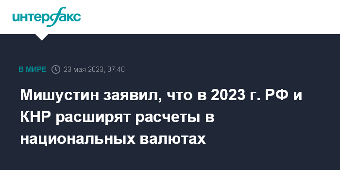 Москва. 23 мая. INTERFAX.RU - Премьер РФ Михаил Мишустин заявил, что в 2023 году Россия и Китай доведут взаимный товарооборот до 200 млрд долларов и расширят расчеты в национальных валютах.