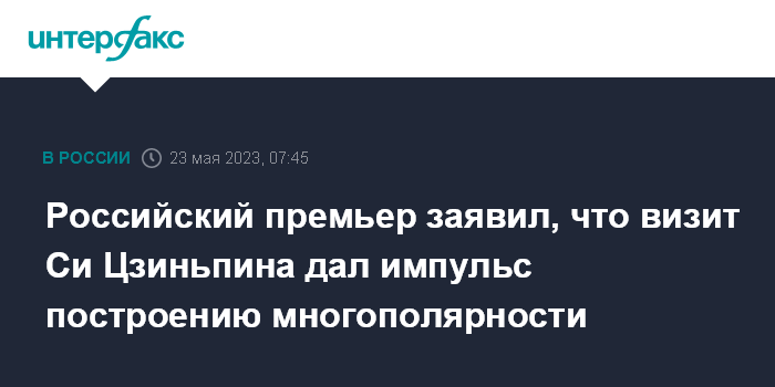 Москва. 23 мая. INTERFAX.RU - Визит в Россию в марте этого года председателя КНР Си Цзиньпина дал импульс построению новой многополярной системы международных отношений, заявил премьер РФ Михаил Мишустин.