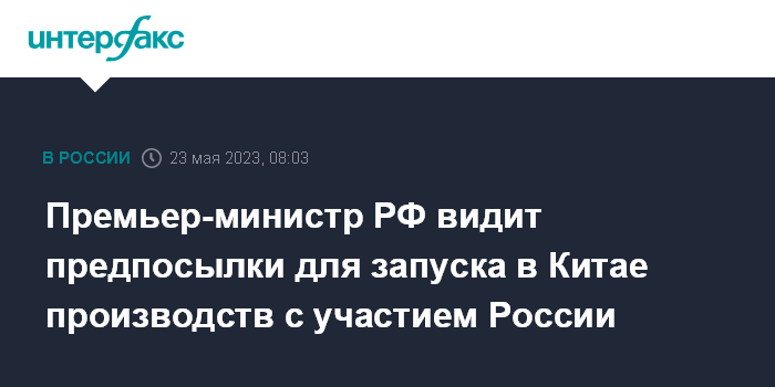 Москва. 23 мая. INTERFAX.RU - Премьер-министр Михаил Мишустин, выступая в Шанхае на российско-китайском бизнес-форуме, высказался за запуск совместных производств на китайской территории.