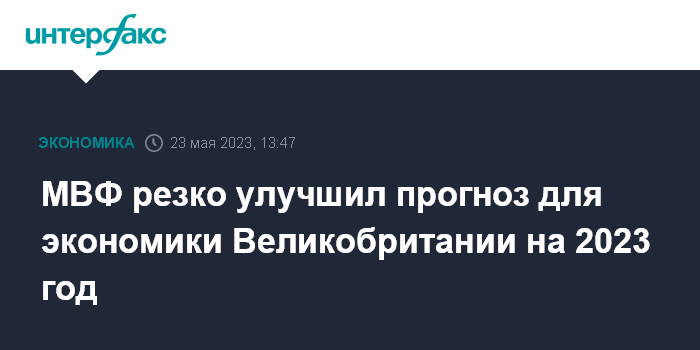Москва. 23 мая. INTERFAX.RU - Международный валютный фонд (МВФ) существенно улучшил прогноз для экономики Великобритании на 2023 год, отметив устойчивость как внутреннего спроса, так и предложения.