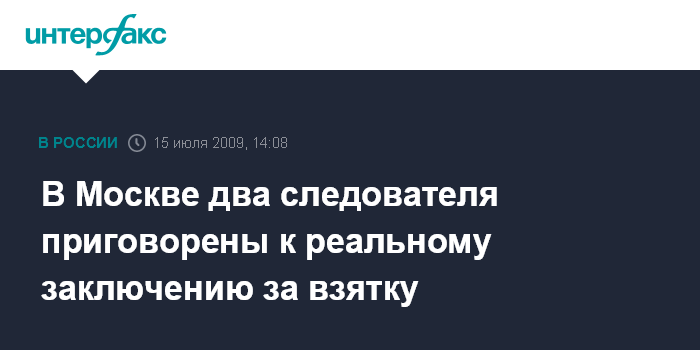 Москва. 15 июля. INTERFAX.RU - Мосгорсуд приговорил к семи и восьми годам заключения двух следователей линейного ОВД станции "Москва-Белорусская", признав их виновными в получении взятки в $250 тысяч.