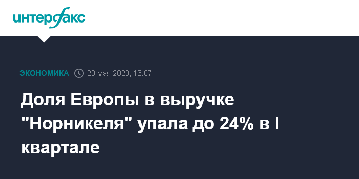 Москва. 23 мая. INTERFAX.RU - В I квартале 2023 года доля Европы в структуре выручки "Норникеля" снизилась до 24% с 47% по итогам прошлого года. Такие данные привел вице-президент "Норникеля" по работе с инвесторами и устойчивому развитию Владимир Жуков в ходе презентации итогов компании в области устойчивого развития за 2022 год.