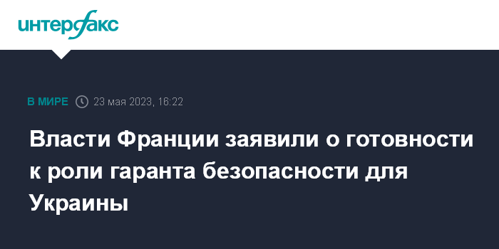 Москва. 23 мая. INTERFAX.RU - Франция обсуждает с партнерами возможные соглашения о гарантиях безопасности для Украины в перспективе будущих угроз для страны, заявил во вторник на брифинге представитель французского МИД.