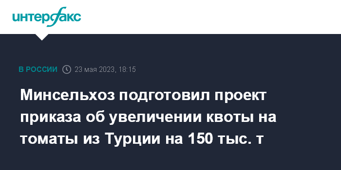 Москва. 23 мая. INTERFAX.RU - Минсельхоз РФ подготовил проект приказа об увеличении квоты на поставки томатов из Турции на 150 тыс. тонн, до 500 тыс. тонн.