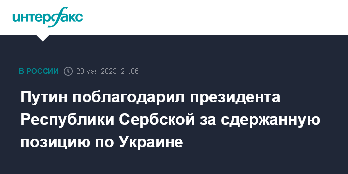 Москва. 23 мая. INTERFAX.RU - Президент РФ Владимир Путин выразил признательность руководителю Республики Сербской (в составе Боснии и Герцеговины) Милораду Додику за сдержанную позицию по Украине, заметив, что только такое отношение к ситуации может привести к положительному решению.