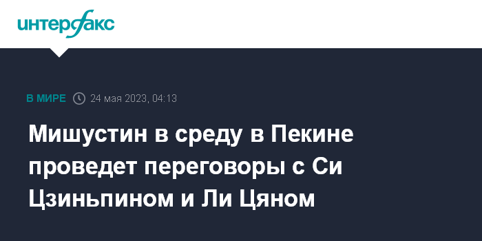 Москва. 24 мая. INTERFAX.RU - Премьер-министр РФ Михаил Мишустин в среду в Пекине проведет переговоры с высшим руководством Китая.