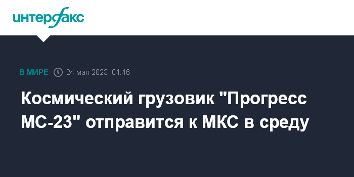 Москва. 24 мая. INTERFAX.RU - Транспортный грузовой корабль "Прогресс МС-23", как ожидается, отправится к Международной космической станции (МКС) с космодрома Байконур в среду.
