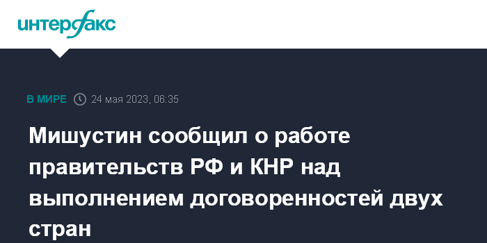 Москва. 24 мая. INTERFAX.RU - Правительства России и Китая уже скоординировано работают над выполнением договоренностей, достигнутых в ходе визита в марте в Москву председателя КНР Си Цзинпина, сообщил премьер РФ Михаил Мишустин.
