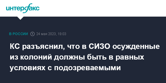 Москва. 24 мая. INTERFAX.RU - Конституционный суд разъяснил норму о содержании в камерах СИЗО осужденных из исправительных колоний, сообщает сайт суда.