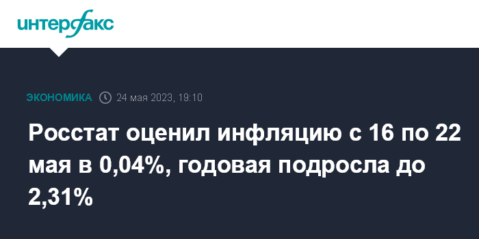 Из данных за 22 дня мая этого и прошлого годов следует, что годовая инфляция в России на 22 мая ускорилась до 2,31% с 2,26% на 15 мая, если ее высчитывать из недельной динамики, и ускорилась до 2,35% (с 2,34% на 15 мая), если высчитывать из среднесуточных данных за весь май 2022 года (на такую методику расчета перешло Минэкономразвития в феврале).