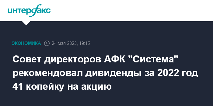Москва. 24 мая. INTERFAX.RU - Совет директоров ПАО АФК "Система" рекомендовал акционерам утвердить размер дивидендов по итогам 2022 года в 0,41 рубля на обыкновенную акцию, сообщила корпорация.