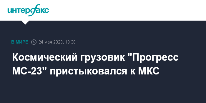 Москва. 24 мая. INTERFAX.RU - Транспортный грузовой корабль "Прогресс МС-23", стартовавший ранее в среду с космодрома Байконур, пристыковался к Международной космической станции (МКС), следует из трансляции "Роскосмоса".