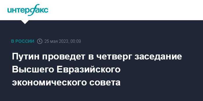 Москва. 25 мая. INTERFAX.RU - Президент РФ Владимир Путин в четверг в Кремле проведет заседании Высшего Евразийского экономического совета.