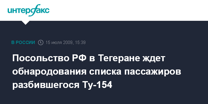 Тегеран. 15 июля. INTERFAX.RU - Посольство России в Иране ожидает, когда иранская авиакомпания Caspian Airlines, чей самолет Ту-154 разбился в среду на северо-западе Ирана, обнародует списки пассажиров данного рейса с указанием их гражданства.