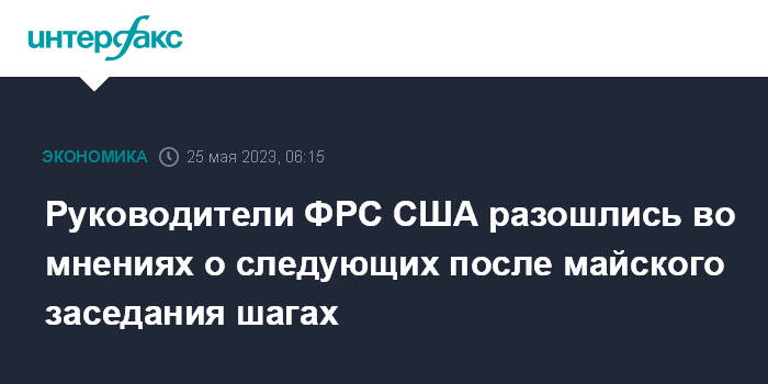 Москва. 25 мая. INTERFAX.RU - Руководители Федеральной резервной системы (ФРС) единогласно поддержали повышение базовой процентной ставки на майском заседании, однако разошлись во мнениях о том, насколько необходимо дальнейшее ужесточение денежно-кредитной политики.