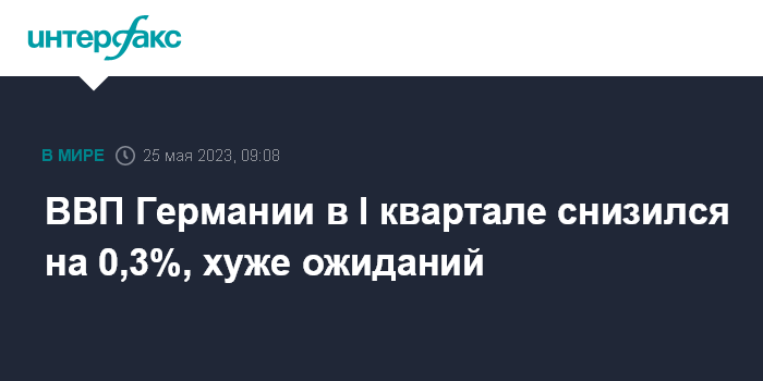 Москва. 25 мая. INTERFAX.RU - ВВП Германии в первом квартале 2023 года снизился на 0,3% по сравнению с предыдущими тремя месяцами, согласно окончательным данным Федерального статистического агентства ФРГ (Destatis).