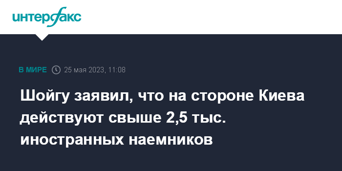 Москва. 25 мая. INTERFAX.RU - Западные страны заставляют власти Украины демонстрировать тактические успехи на поле боя, накачивают страну оружием, это приводит к эскалации конфликта и затягивает его, заявил министр обороны РФ Сергей Шойгу; он также сообщил, что на стороне Украине действуют свыше 2,5 тыс. иностранных наемников.