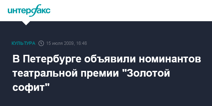 Москва. 15 июля. INTERFAX.RU - В Петербурге в среду объявлены номинанты XV Высшей театральной премии города "Золотой софит" по итогам театрального сезона 2008-2009 годов.