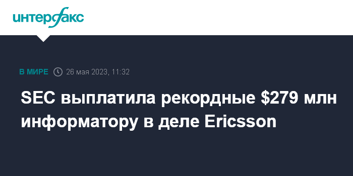Москва. 26 мая. INTERFAX.RU - Комиссия по ценным бумагам и биржам (SEC) присудила вознаграждение в размере $279 млн информатору, добровольно предоставившему наводку о даче взяток представителями шведской компании Ericsson.