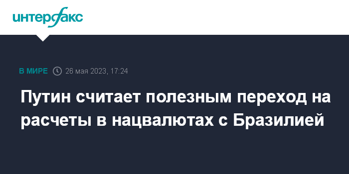 Москва. 26 мая. INTERFAX.RU - Президент РФ Владимир Путин заявил, что считает перспективным переход на расчеты в национальных валютах с Бразилией.