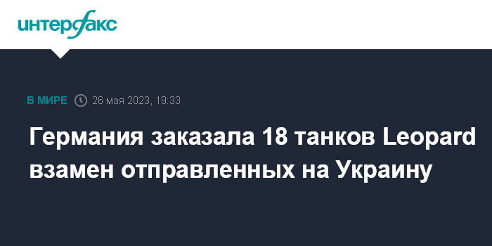Москва. 26 мая. INTERFAX.RU - Германия заказала у компании Kraus-Maffei Wegmann 18 новых танков "Леопард" взамен отправленных ранее на Украину, сообщает АР со ссылкой на заявление компании.