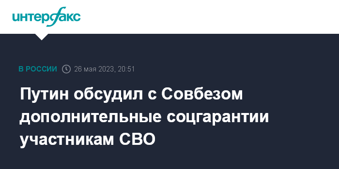 Москва. 26 мая. INTERFAX.RU - Президент Владимир Путин и постоянные члены Совета безопасности обсудили на совещании в пятницу дополнительные меры социальных гарантий участникам специальной военной операции и членам их семей.