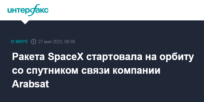 Москва. 27 мая. INTERFAX.RU - Ракета Falcon 9 в субботу стартовала на орбиту с телекоммуникационным спутником BADR-8 арабского оператора Arabsat, сообщила компания-разработчик носителя SpaceX.