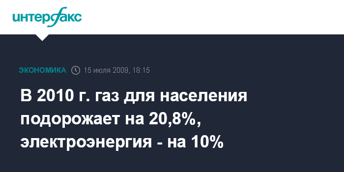 Москва. 15 июля. INTERFAX.RU - Цена на газ для населения в 2010 г. вырастет на 20,8%, тарифы на электроэнергию на 10%, тарифы на железнодорожные перевозки на 10%.