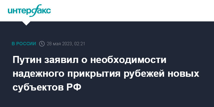 Москва. 28 мая. INTERFAX.RU - Президент РФ Владимир Путин отметил необходимость надежного прикрытия рубежей в непосредственной близости от зоны боевых действий, обеспечения быстрой доставки грузов, продовольствия и стройматериалов в новые российские субъекты.
