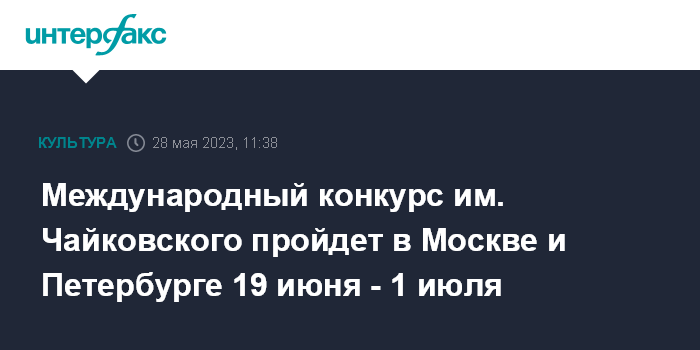 Москва. 28 мая. INTERFAX.RU - XVII Международный конкурс имени П.И.Чайковского пройдет в России с 19 июня по 1 июля 2023 года, соответствующее распоряжение подписал премьер-министр РФ Михаил Мишустин, сообщает в воскресенье сайт правительства РФ.