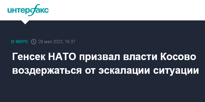 Москва. 28 мая. INTERFAX.RU - Генсек НАТО Йенс Столтенберг в воскресенье обратился к косовским властям с призывом принять меры, направленные на деэскалацию напряженной ситуации на севере Косово.