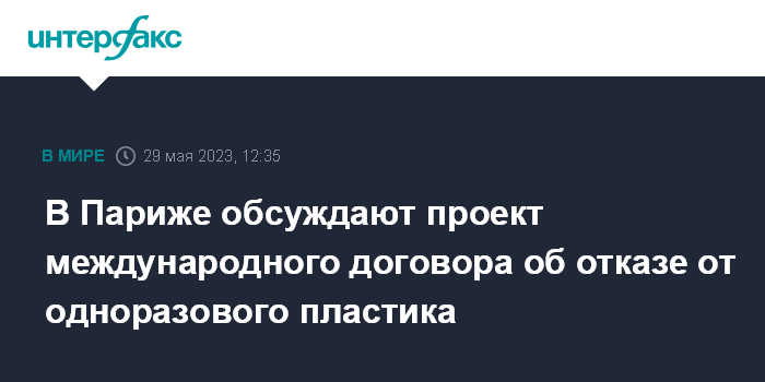 Москва. 29 мая. INTERFAX.RU - В Париже представители 175 стран будут обсуждать с 29 мая до 2 июня подготовку международного договора о мерах борьбы с загрязнением природы пластмассой, сообщает RTBF. Цель договора - полное прекращение использования одноразовых изделий из пластика к 2040 году.