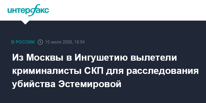 Москва. 15 июля. INTERFAX.RU - Для расследования убийства в Ингушетии правозащитницы из Грозного Натальи Эстемировой на место происшествия вылетела группа криминалистов СКП РФ из Москвы, сообщил "Интерфаксу" в среду официальный представитель ведомства Владимир Маркин.