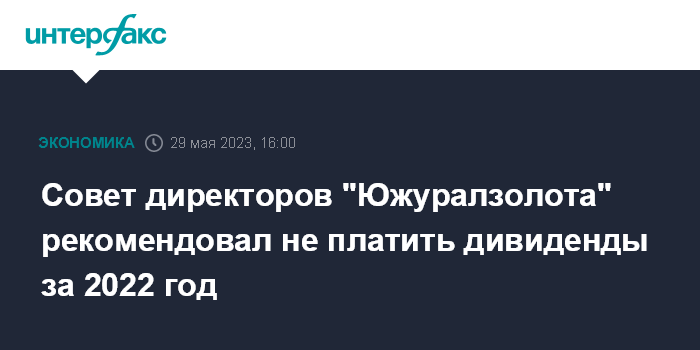Москва. 29 мая. INTERFAX.RU - Совет директоров АО "Южуралзолото группа компаний" (ЮГК) рекомендовал акционерам не выплачивать дивиденды за 2022 год, сообщил золотодобытчик.