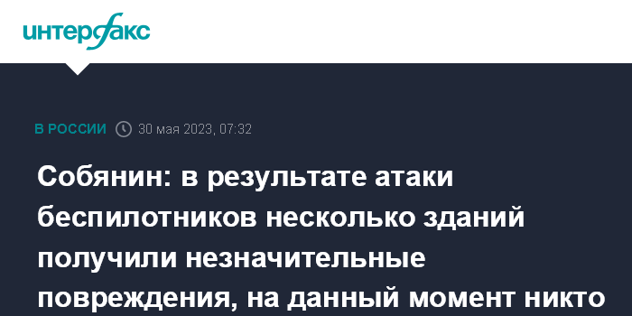 Москва. 30 мая. INTERFAX.RU - В столице рано утром после атаки БПЛА были незначительно повреждены несколько зданий, на данный момент никто серьезно не пострадал, сообщил мэр Москвы Сергей Собянин.