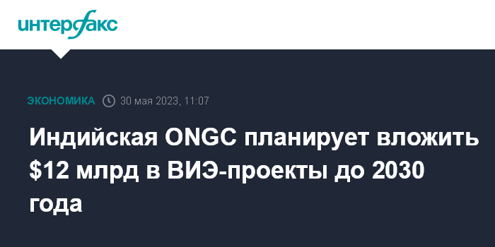 Москва. 30 мая. INTERFAX.RU - Индийская госкомпания Oil and Natural Gas Corp. (ONGC) намерена вложить 1 трлн рупий ($12,1 млрд) до 2030 года в проекты в сфере "зеленой" энергетики.