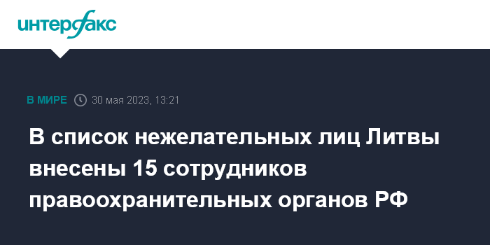 Москва. 30 мая. INTERFAX.RU - Литва добавила в список нежелательных лиц 15 сотрудников российских правоохранительных органов, которые, как считают в Вильнюсе, несут ответственность за преследование оппозиционера Владимира Кара-Мурзы (признан в РФ иноагентом). Соответствующее сообщение распространил во вторник литовский МИД, сославшись на решение МВД.