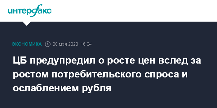 Москва. 30 мая. INTERFAX.RU - Растущий потребительский спрос и ослабление рубля могут способствовать повышению текущих темпов роста потребительских цен и более быстрому ускорению годовой инфляции, говорится в бюллетене "О чем говорят тренды", подготовленном департаментом исследований и прогнозирования Банка России.