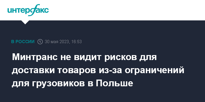 Москва. 30 мая. INTERFAX.RU - Запрет на проезд российских и белорусских грузовиков по территории Польши, который вступит в действие с 1 июня, не окажет влияния на сроки доставки товаров в импортном и экспортном направлениях, заявляют в российском Минтрансе.